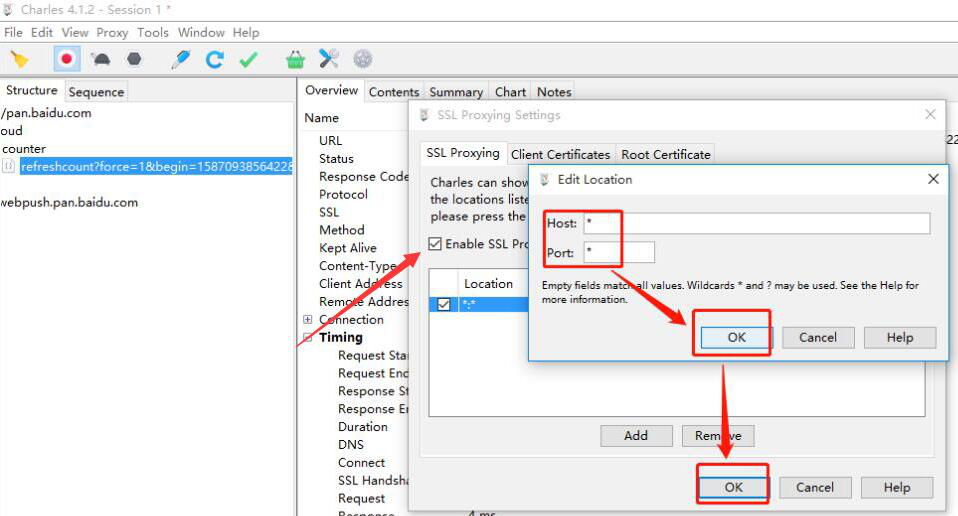 4. 勾选“Enable SSL Proxying”,点击“OK”按钮。并在 Charles 弹出的小窗口中,在 Host 和 Port 对应的文本框中输入“*”再点击“OK”按钮,如下图所示。