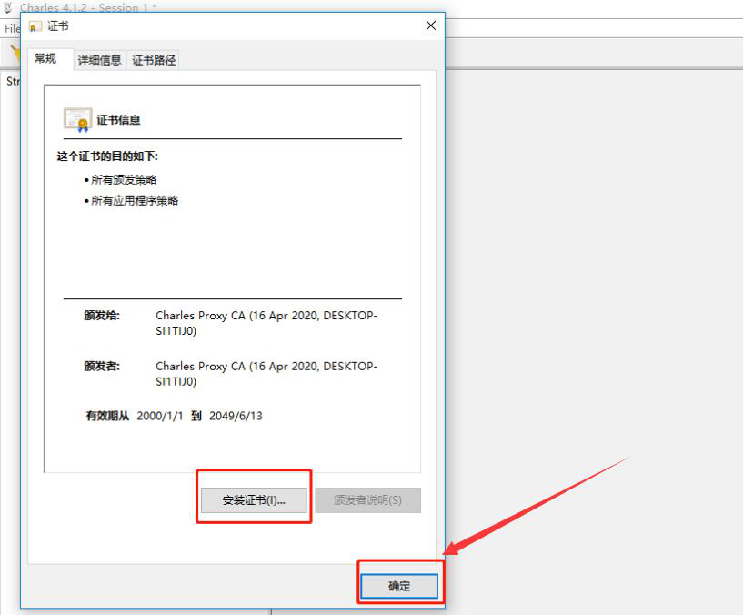 2. 此时,Charles 便会弹出证书窗口。点击“安装证书”按钮,并根据安装向导进行安装,再点击“确定”按钮,从而完成 Charles 抓包的证书安装。