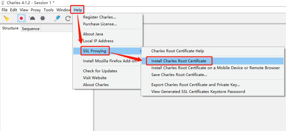 1. 想要用 Charles 抓包,就得先安装证书。我们点击“Help”菜单中的“SSL Proxying”和它子菜单中的“install charles root Certificate”。