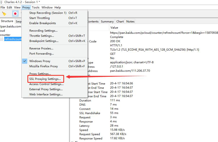 3. 然后,我们还需要配置 HTTP(S) 数据包。点击 Charles“Proxy”菜单的“SSL Proxying Settings”,开始对 Charles 抓包证书进行配置。