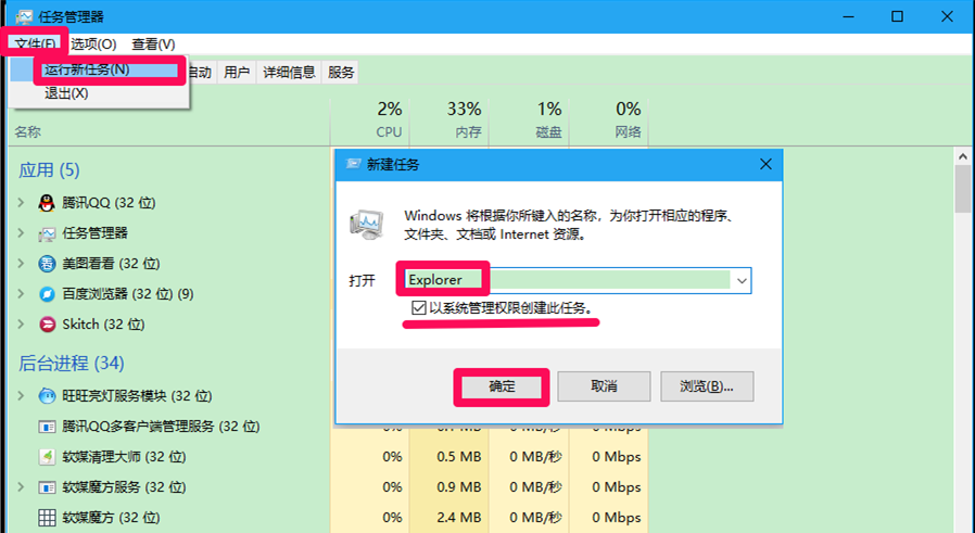 打开任务管理器,点击左上角的“文件”->“运行新任务”,弹出新建任务对话框->输入Explorer->同时勾选“以系统管理权限创建此任务”,->确定,