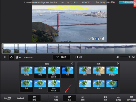 4. 点击“编辑”组件中的“修正”,此时,用户可以看到修正中的各种优化效果。vreveal 修复模糊视频时,可以同时使用多个修正的效果来修复视频,让视频播放起来更清晰。