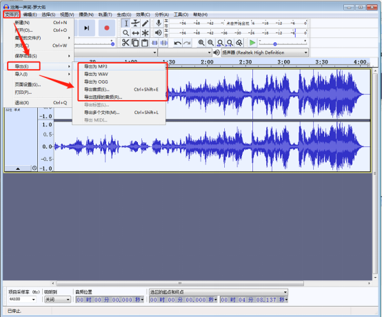 8. 试听完毕后,点击“文件”->“导出”,然后选择合适的音频格式即可导出了。