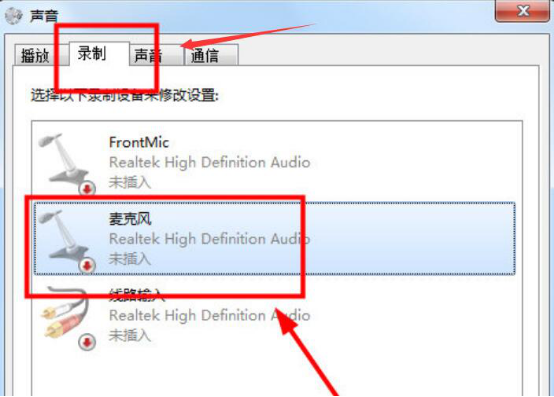6. 在声音界面中,选择“录制”,点击“麦克风”,进入麦克风的设置页面,用户将电脑的麦克风的音量调至最大值。