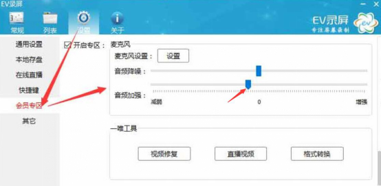 3. 接着切换到 EV 录屏的设置界面,点击“会员专区”,勾选“开启专区”,对音频进行降噪处理,并将音频加强调整到最大值。