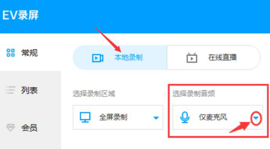 2. EV 录屏前,用户先要在 EV 录屏的常规界面中,点击“本地录制”,选择录制音频的来源。