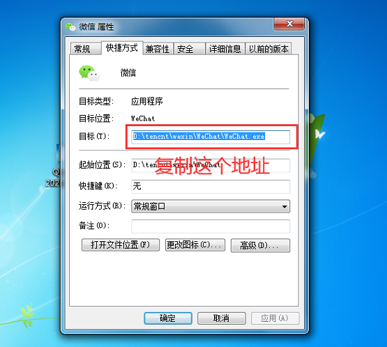 2. 进入微信属性面板,点击【目标】,查看应用程序的所在位置,进行复制