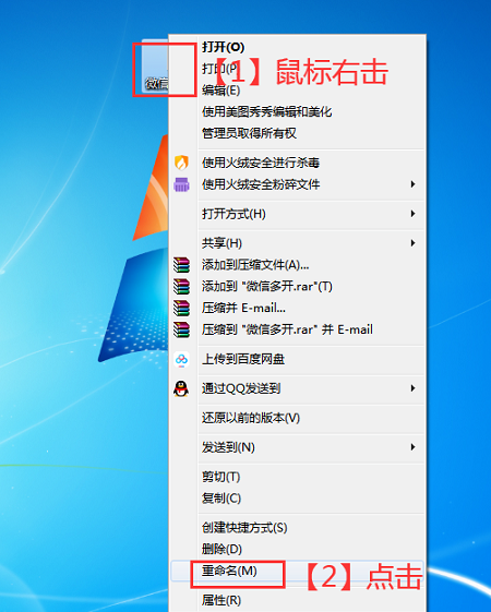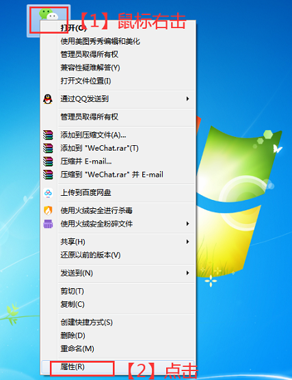 1. 打开电脑,使用鼠标右击桌面上的微信图标,弹出菜单,选择【属性】,如图所示