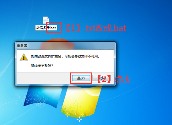 7. 文件重命名为“微信多开”,并将后缀“.txt”修改为“.bat”,弹出对话框,点击【是】