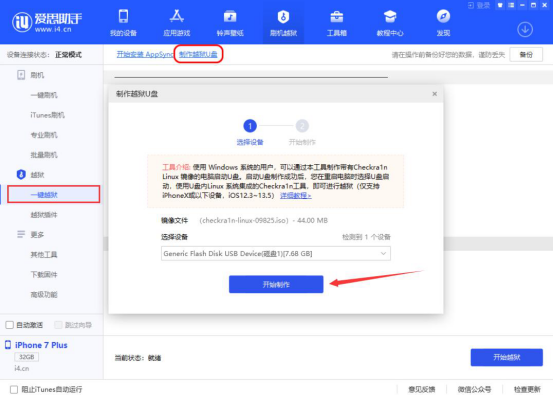 2. 然后,点击“制作越狱 U 盘”,爱思助手便会弹出如下图窗口,点击“开始制作”按钮。