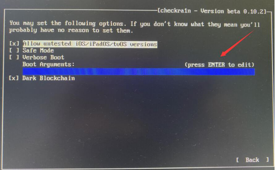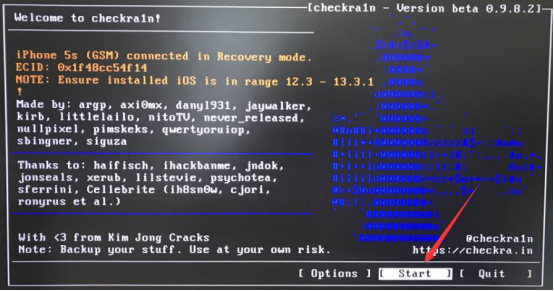 6. 爱思助手制作好的越狱U盘被启动后便会进入 Checkra1n 界面,利用电脑键盘的方向键选择界面右下方的“Start”。