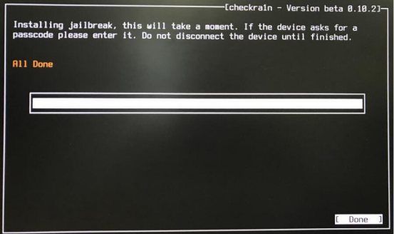 9. 越狱完成之后,Checkra1n 界面会有黄色提示“All Done”。