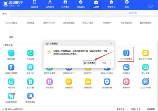 4. 接下来,我们开始使用爱思助手制作好的越狱 U 盘。先将 iPhone 链接到电脑,再切换至“工具箱”菜单页面,点击“进入恢复模式”,弹出提示窗口,点击“进入恢复模式”按钮。