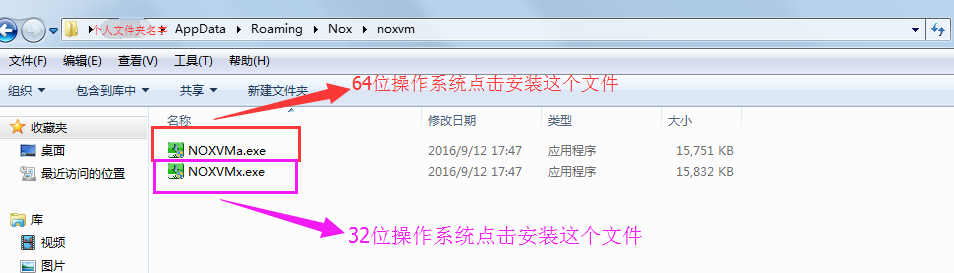 即可看到 NOXVMa.exe 和 NOXVMx.exe 这两个文件,根据自己电脑操作系统来选择安装,64 位系统选择 NOXVMa.exe,32 位系统就选择NOXVMx.exe,
