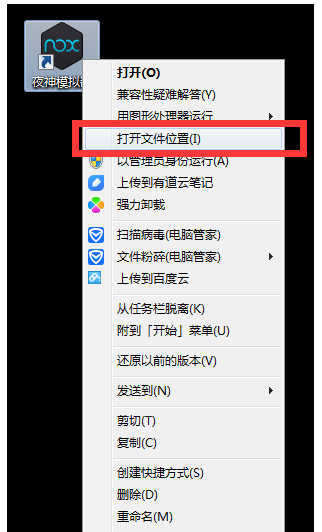 鼠标右击夜神模拟器的快捷方式图标,点击“打开文件所在的位置”,
