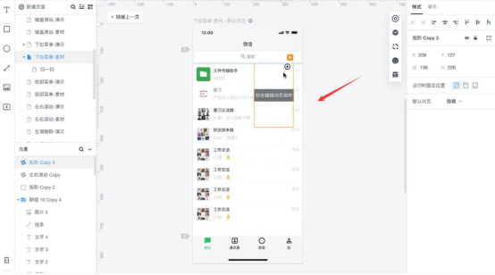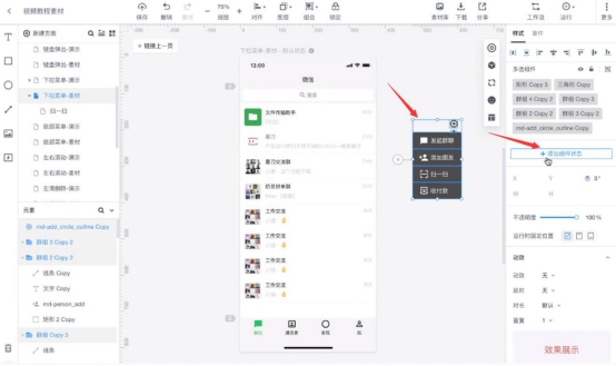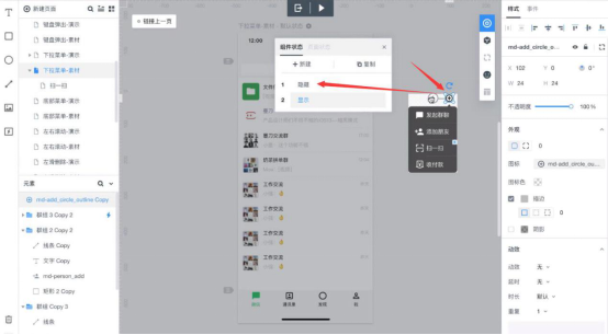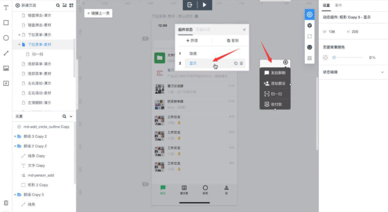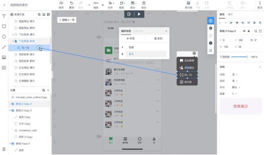 4. 做到这一步,用墨刀做下拉菜单的动态效果的操作过程就完成一半了。接着,用户还需要将状态切换到“显示”。比如当我们把手移动到“扫一扫”的组件时就可以跳转到其对应页面。那么该如何做出动态效果?