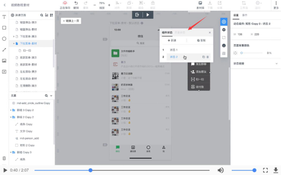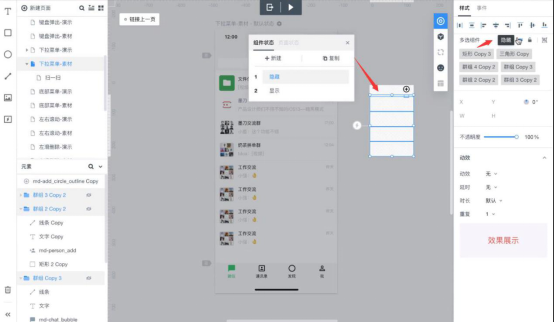 2. 在墨刀动态效果编辑的主界面画布中间会出现“组件状态”的对话框,用户需要编辑状态的名称。状态1为“隐藏”,状态2为“显示”。