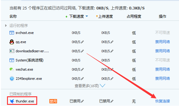 进入界面,可以看到 thunder.exe 程序被禁用,点击右侧“恢复连接”,再次使用迅雷下载文件,问题解决了。
