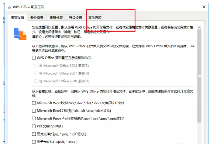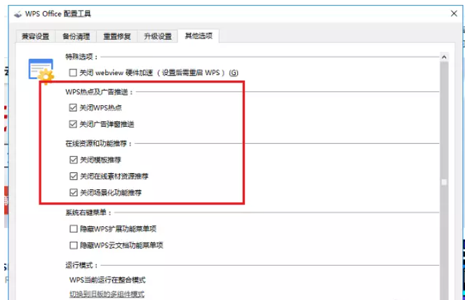 进入 WPS Office 配置工具,点击“其他选项”,如图,点击关闭“WPS 热点和广告推送”,然后关闭所有功能推荐,