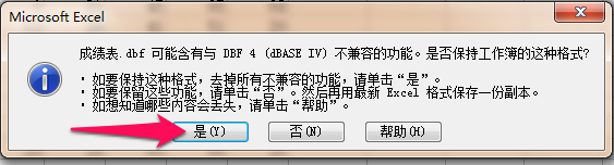 还有提示,当前 DBF 文件可能含有与 DBF4 不兼容的功能,点击是, 去掉所有不兼容的功能,