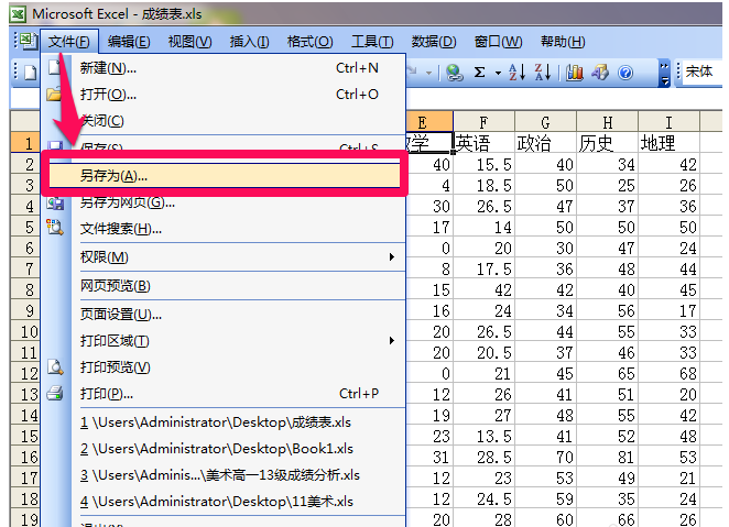 打开需要转换格式的 Excel 表格文件,如图,点击“文件”->“另存为”选项,