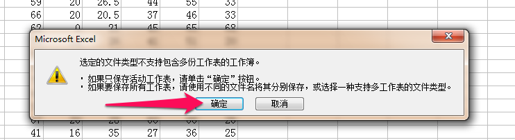 出现提示,选择的文件类型不支持包含多份工作表的工作簿,点击确定,
