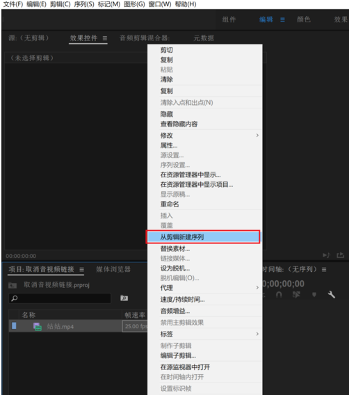 右键单击视频素材,点击“从剪辑新建序列”,如图,