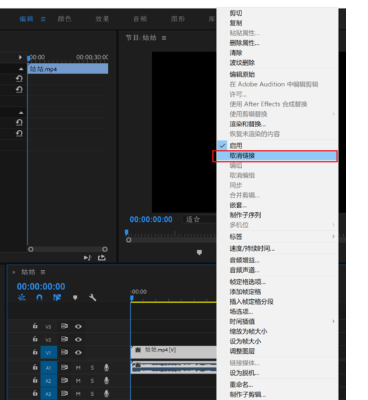 右键单击视频轨道,在弹出的菜单中点击“取消链接”,如图,