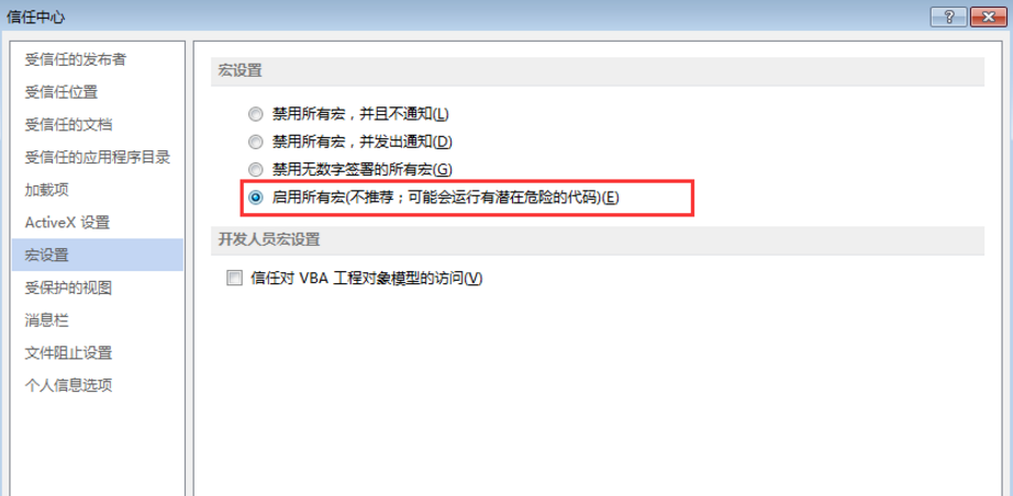 6. 在宏设置中,勾选启用所有宏,然后点击确定,这样设置后,再打开 word 文档就会有提示安全警告了!