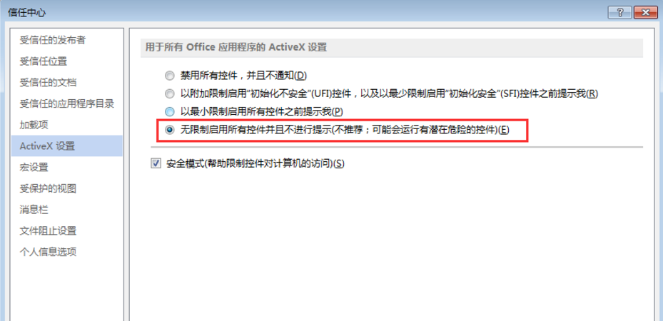 5. 在 ActiveX 设置中,勾选无限制启用所有控件并且不进行提示,
