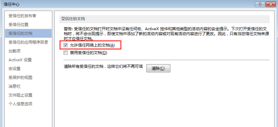 4. 在受信任的文档中,勾选允许信任网络上的文档,如图,