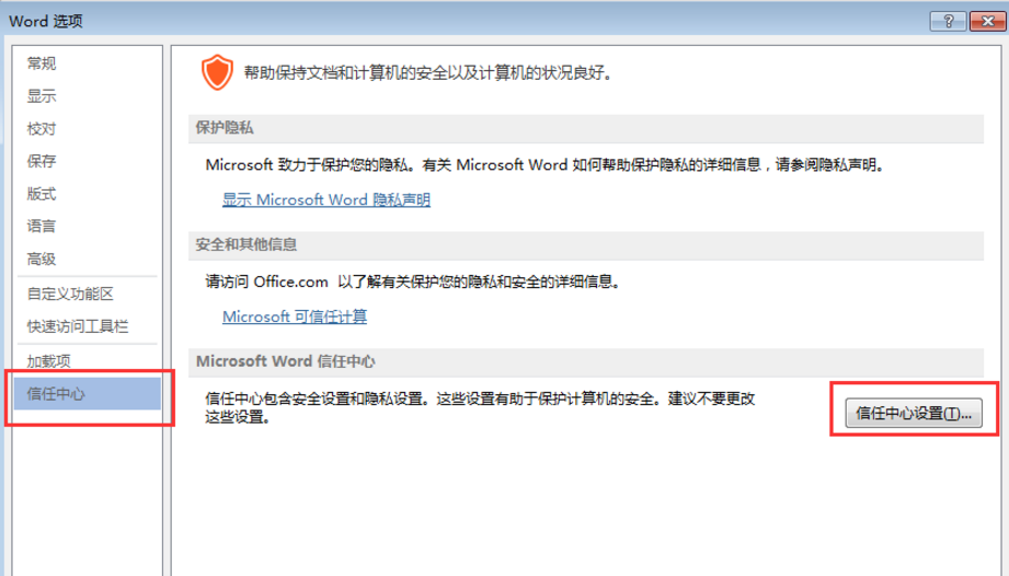 3. 弹出 word 选项操作界面,在左侧中点击“信任中心”,再点击“信任中心设置”,