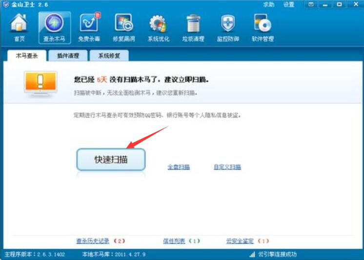 2. 打开电脑里安装的金山卫士,快速扫描电脑,清除电脑的木马病毒。因为如果电脑中木马劫持了 Flash 的相关文件,也会出现星愿浏览器下载视频打不开的情况。