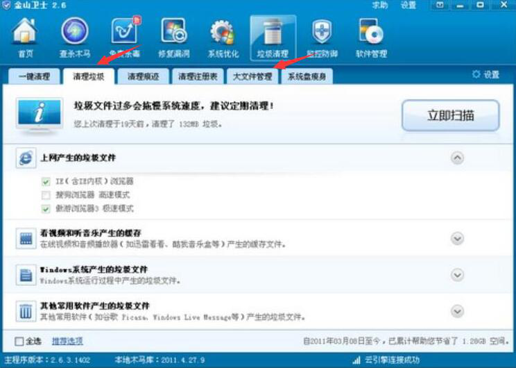 3. 使用金山卫士清除电脑中的垃圾,并且查看电脑有没有正在用 p2p 下载软件,导致自己的网络资源被占用了。如果有的话,先将 p2p 关闭。