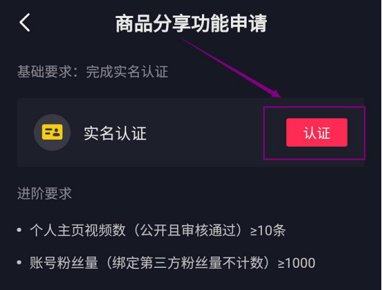 6. 抖音挂小黄车,要实名认证,所以,在商品分享功能申请页面中,点击“认证”按钮。