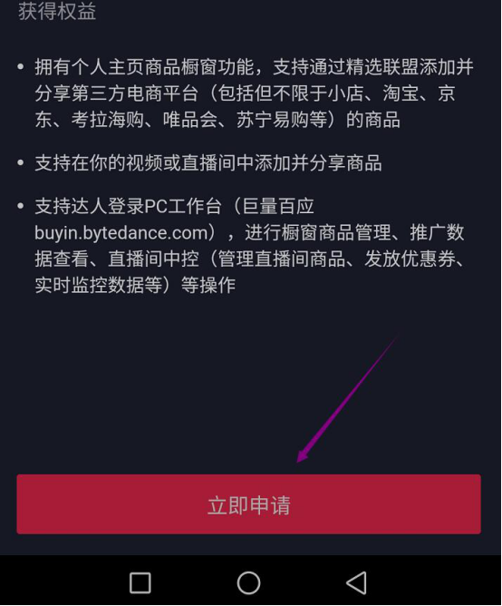 8. 最后,还要点击“立即申请”按钮,才能申请抖音挂小黄车的服务。