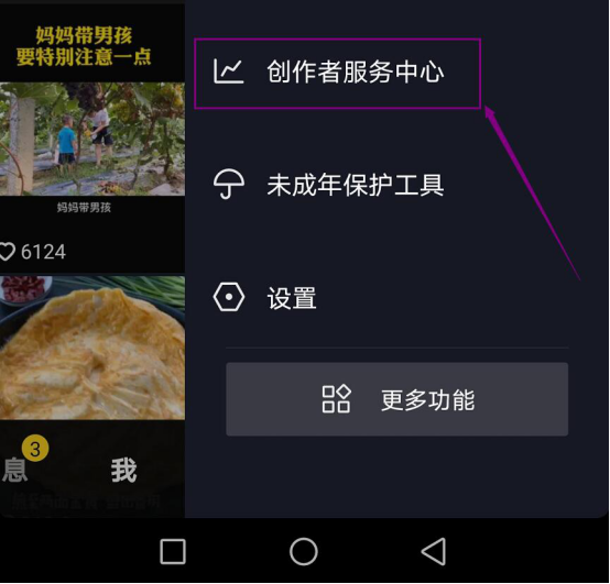 3. 然后,在抖音弹出的菜单项目中点击“创作者服务中心”。