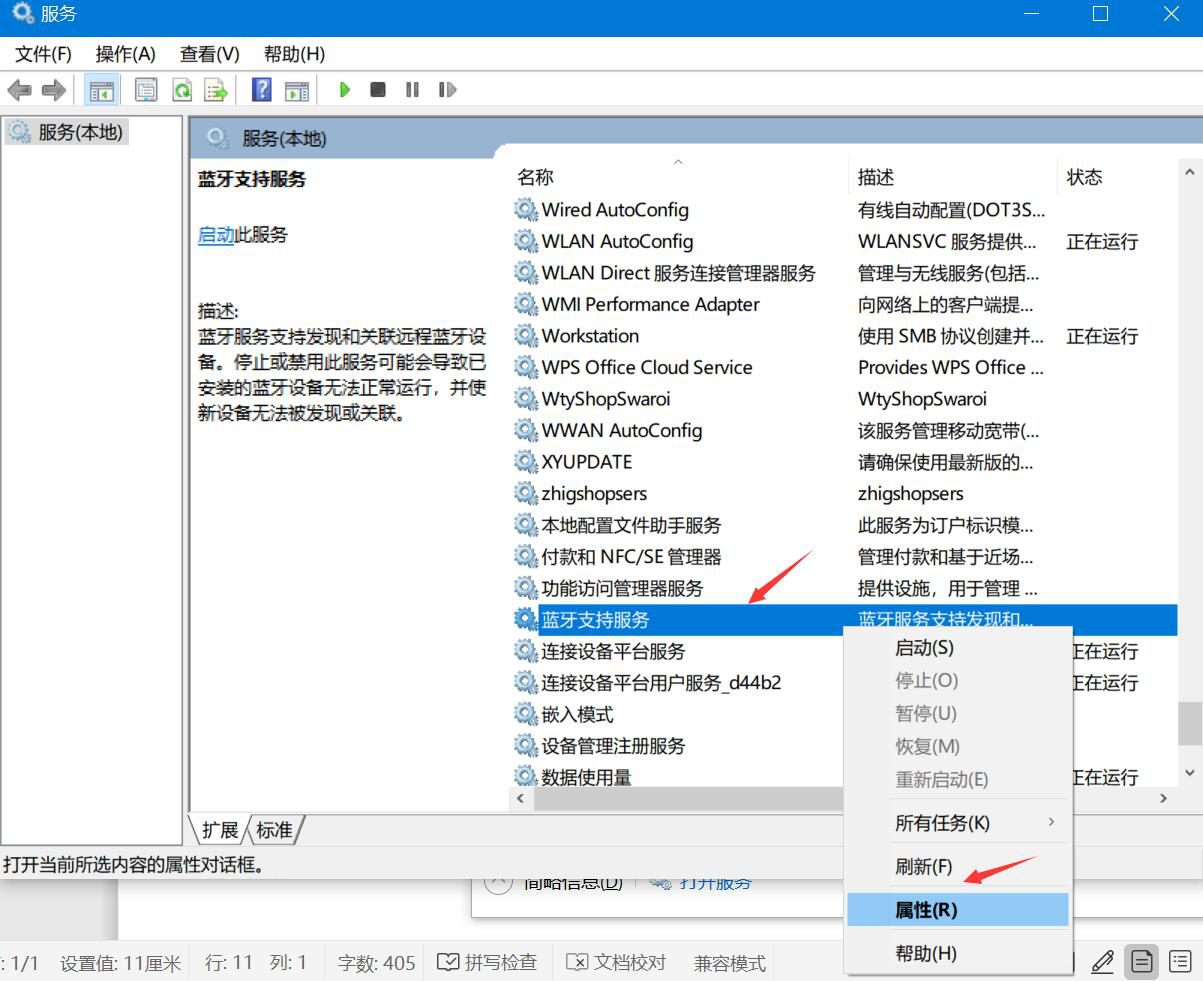 3. 在服务(本地)的界面中,再次找到并右键单击“蓝牙支持服务”,在右键菜单中点击“属性”。