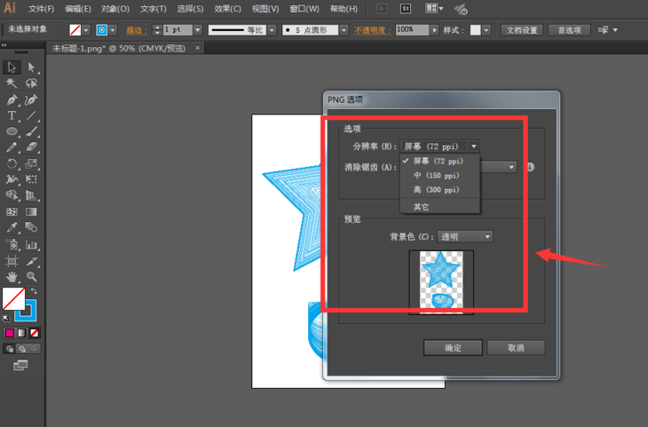 在导出选项栏中,选择导出图片的分辨率和背景色,确定
