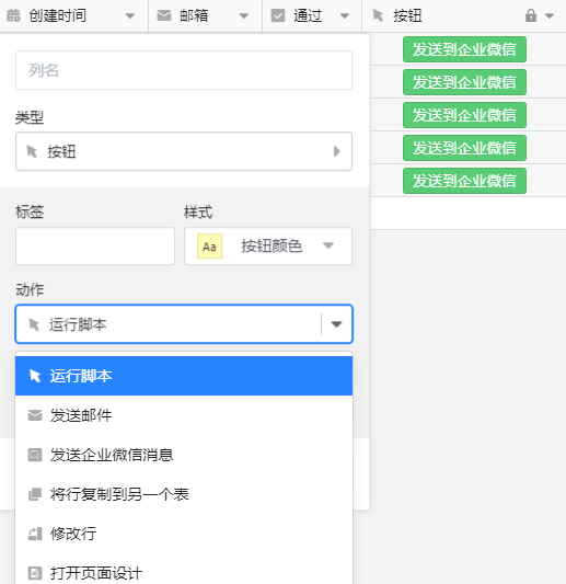 “按钮”列类型是一种交互式字段类型。在单元格中点击按钮即可执行指定的动作,包括:运行脚本、发送邮件、发送企业微信消息、将行复制到另一个表、修改行等。并且还可以设置按钮的名称、颜色。后续版本还会增加更方便的自动化触发规则。