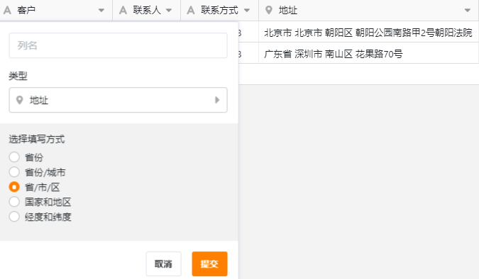 它支持省份、省份/城市、省/市/区、国家和地区、经度和纬度这 5 种填写方式。选择填写方式后,双击单元格就能直接选择地址。并且它还能自动识别地址信息。“地址”类型通常可配合“地图”插件来使用,可以在地图上把地址等字段信息直观地展示出来。
