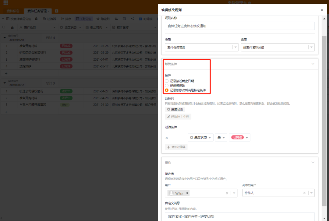 它可以对表格里的记录接近截止日期、记录被修改、记录被修改后满足特定条件自动发出提醒通知。如果两分钟内没有点开阅读,它还会以微信公众号消息的形式发送到手机。做你贴心的小秘书。