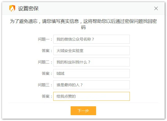 但时间久了,保护密码容易被遗忘,这就会导致你进行正常操作的时候,也被限制了,比如你要对隔离区的某个文件添加白名单,如果你忘记了保护密码,那就尴尬了。于是,就有用户建议火绒对密码保护功能进行升级,即增加一个密码提示功能。现在,这个功能终于上线了!在最新版火绒里,当你设置保护密码的时候,可以同时设置三个提示问题以此来帮助你找回忘记的保护密码。