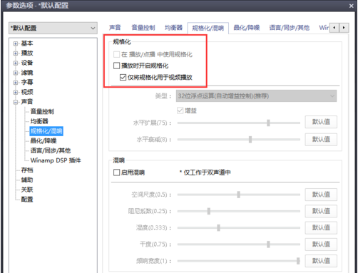 在"规格化/混响"里,如果你打算听到视频资源原汁原味的声音也可以不勾选"仅将规格化拥有视频播放",不过会觉得声音忽大忽小的。
