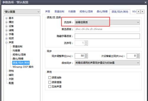 然后是"声音"里面的"规格化/混响"和"语言/同步/其他"两项。你可以如图设置。
