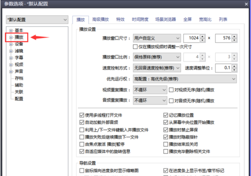 接下来我们点击"播放"进行"播放设置","播放器窗口尺寸"建议使用 1024*576,从屏幕比例上来说,1024*576 、 1280*720 、1920*1080都是 16:9 的比例,你会发现几乎所有的高清资源都是这些尺寸,这样设置就不会因为播放不同片源时重新调整播放器窗口从而造成比例失常,其它如图设置就行。