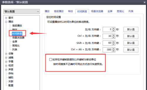 同样点开左方框里的"播放"的扩展菜单,设置"时间跨度"、"宽高比"、"列表"这几项。"时间跨度"里的"如存在关键帧数据则以关键帧为移动单位"不要勾,勾了的话当你快进时会不按照时间来跳。