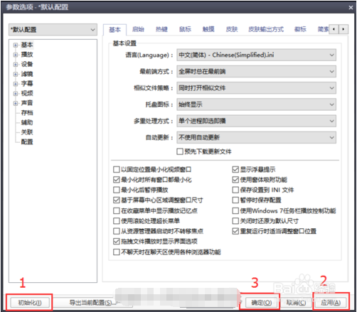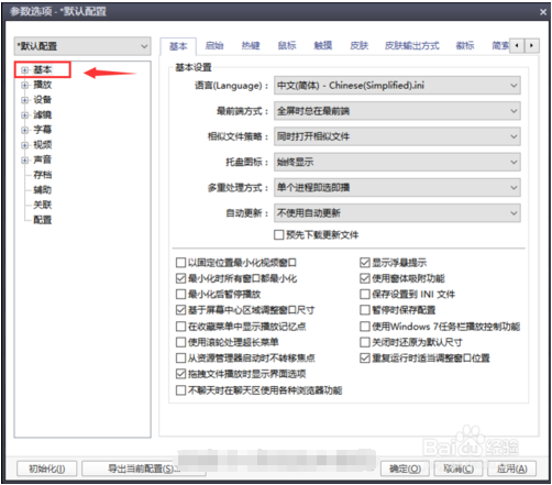 3. 再次打开 potplayer 播放器设置菜单,我们正式开始设置,首先点击左方框里的"基本",来进行基本设置,基本设置里有许多选项,我们设置的目的就是为了适合自己的使用习惯,建议作如图设置。