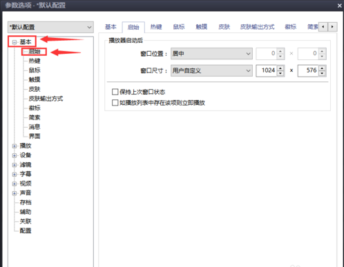 4. 点开左方框里的"基本"的扩展菜单,这里我们只需要设置"启始"和"鼠标"两项就好。"启始"是指你打开播放器后,播放器在桌面的位置,一般如图设置。