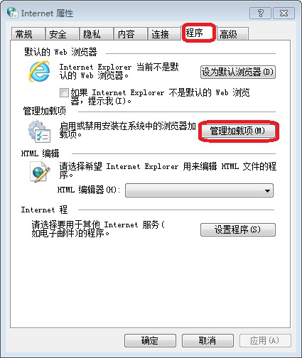 2. 弹出 Internet 属性窗口,点击最上方选项"程序",然后点击下方"管理加载项"。